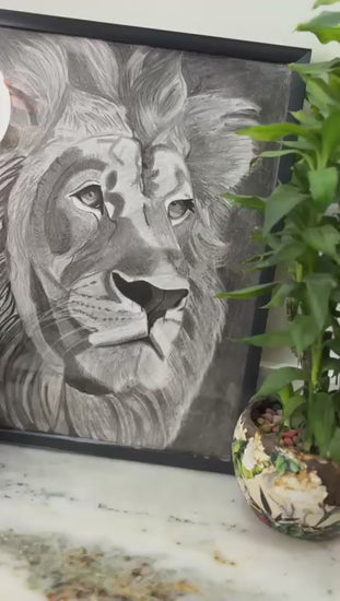 Rendered entirely in charcoal, the artist brings out the richness of fur, depth of gaze, and dignity of expression with remarkable precision. Every line and shadow evokes courage, wisdom, and presence, making it a timeless piece that speaks volumes without uttering a word.