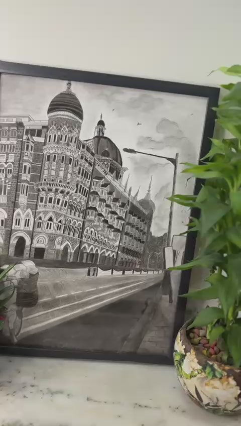 This striking charcoal artwork captures the architectural grandeur and historic elegance of the iconic Taj Mahal Palace Hotel in Mumbai. Rendered with intricate precision and dramatic shading, the artist brings to life the Indo-Saracenic domes, arched windows, and elaborate detailing that define this legendary landmark. The perspective, set against a moody sky and empty promenade, adds an atmospheric depth — evoking both the resilience and serenity of the building through time.