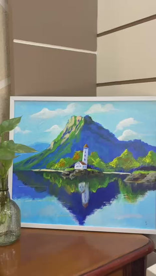 The use of vivid blues, lush greens, and warm golden hues evokes a sense of calm and clarity, while the masterful reflections create a dreamlike symmetry that draws the viewer inward. The crisp brushwork and vibrant contrasts bring this picturesque scene to life, making it a captivating centerpiece for any room.